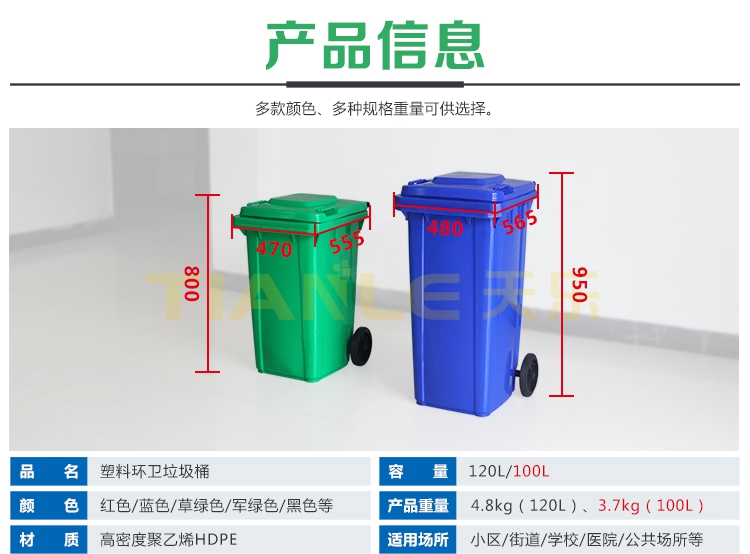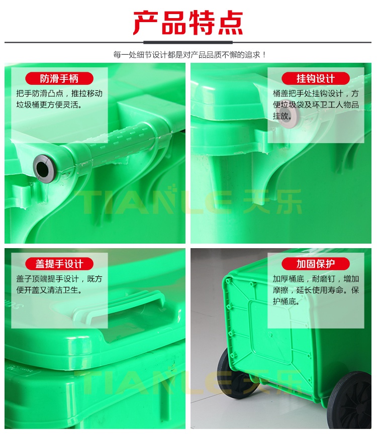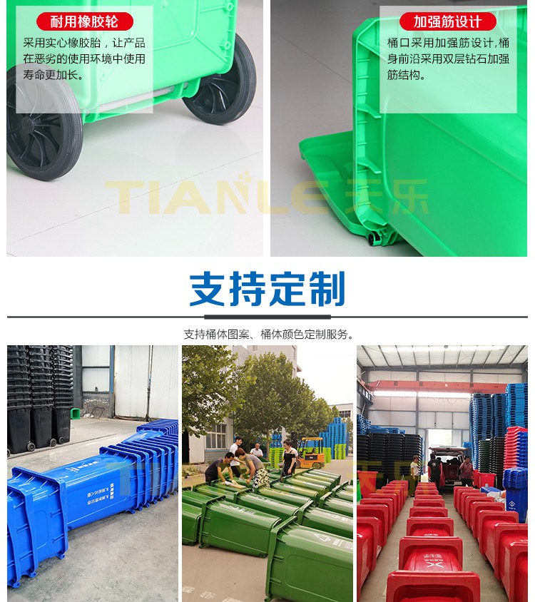 山東天樂(lè)塑料科技有限公司(簡(jiǎn)稱:天樂(lè)塑業(yè))是一家集研發(fā),設(shè)計(jì),制造,銷售為一體的大型生產(chǎn)塑料產(chǎn)品企業(yè),公司擁有大型注塑、吹塑成型設(shè)備十多臺(tái),經(jīng)驗(yàn)豐富的設(shè)計(jì)研發(fā)團(tuán)隊(duì),可提供產(chǎn)品定制服務(wù)。生產(chǎn)240L分類垃圾桶、120L/100L/50L/30L塑料垃圾桶、40L/20L雙胞胎垃圾桶、660L掛車?yán)?、智能垃圾桶、塑料托盤(注塑、吹塑托盤)、塑料周轉(zhuǎn)箱(筐)、塑料折疊箱、PP中空板、拉伸纏繞膜等系列產(chǎn)品。塑料垃圾桶產(chǎn)品適用于城市街道、小區(qū)物業(yè)、商業(yè)樓宇
